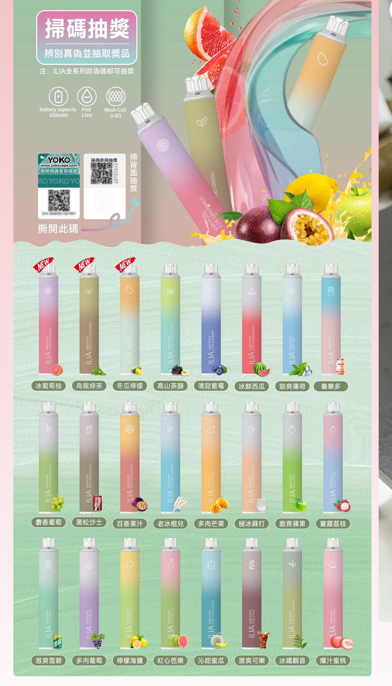 < img height="1" width="1" style="display:none" src="https://www.facebook.com/tr?id=641530305674067&ev=PageView&noscript=1" /> 【台灣現貨】ILIA哩亞Bar4代 6500口 一次性電子煙 大容量拋棄式 - 臺灣電子煙商店